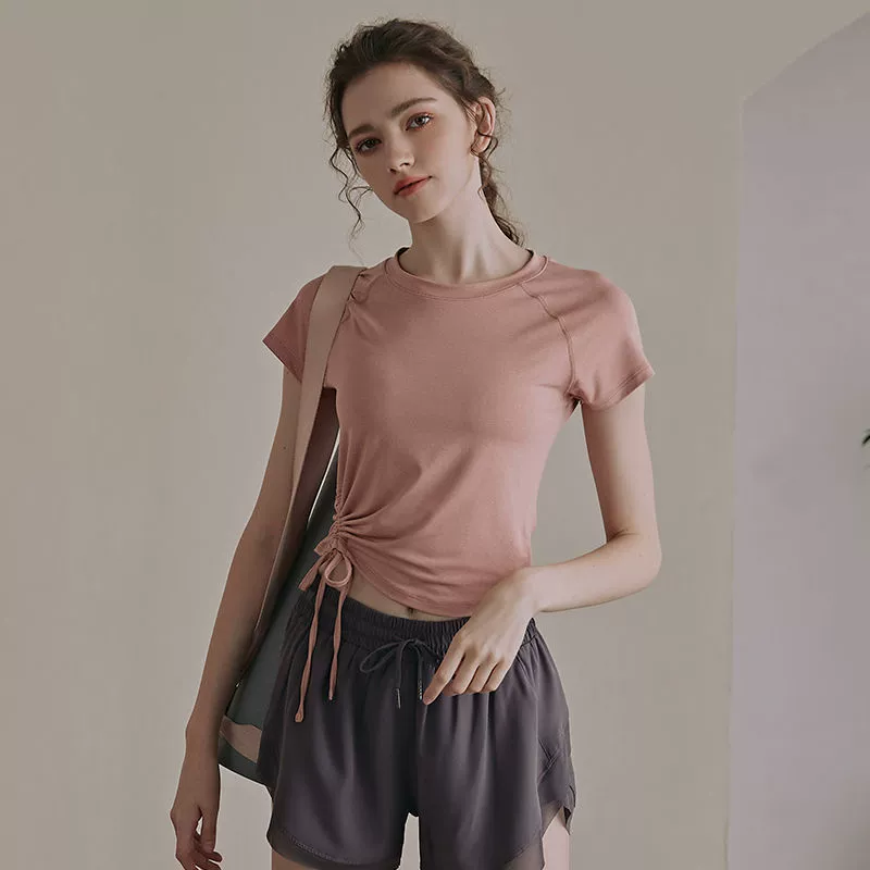 新款夏薄款抽绳瑜伽服女 短袖T恤速干运动上衣专业跑步健身服套装