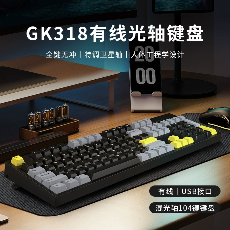 GK318电竞网咖光轴游戏机械键盘104键全键无冲插拔防水混光键盘