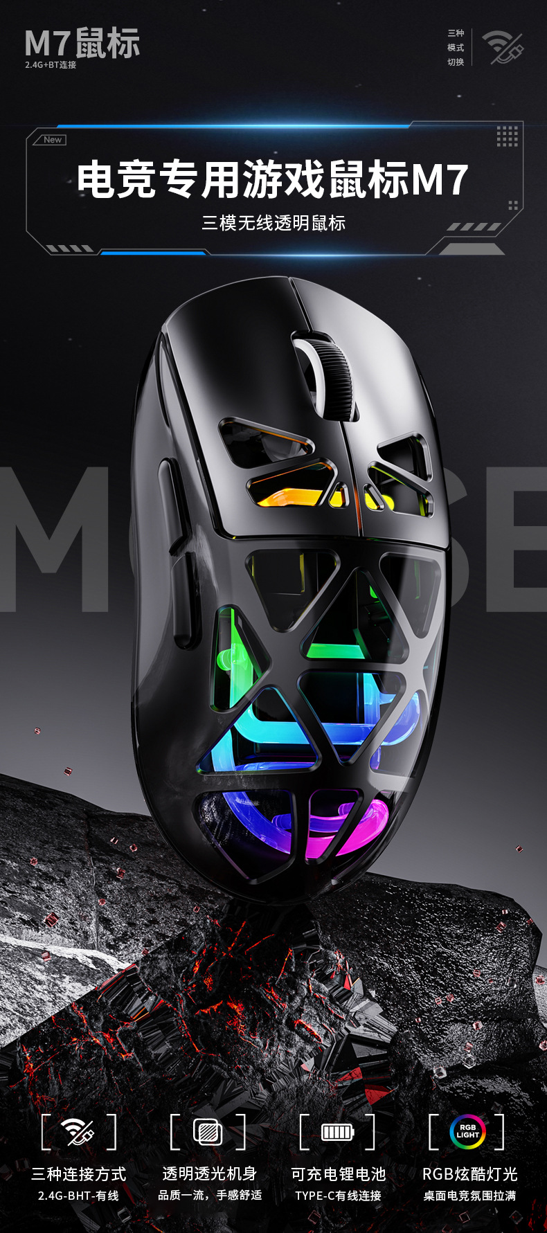M7镂空轻量化洞洞三模蓝牙无线2.4G充电游戏电竞RGB发光鼠标